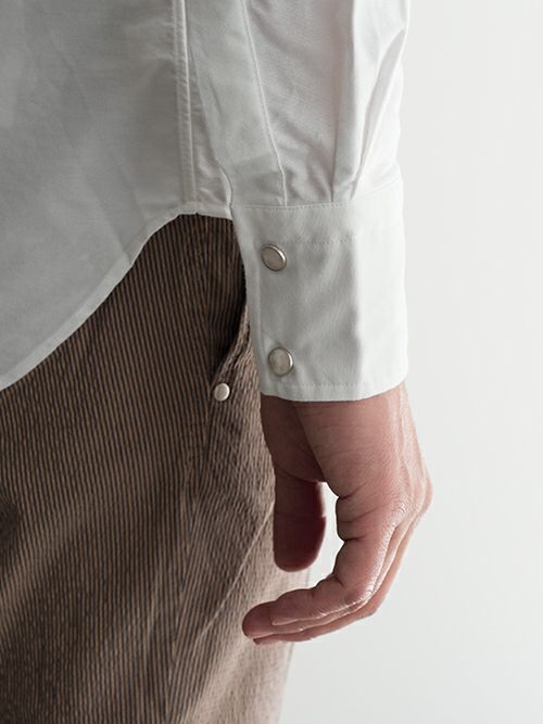 オックスフォード生地のウエスタンシャツ。襟型がナローショートでカジュアルに寄りすぎない上品な仕上がりです。
