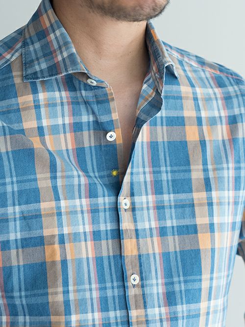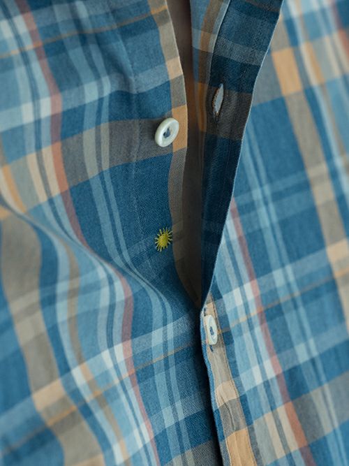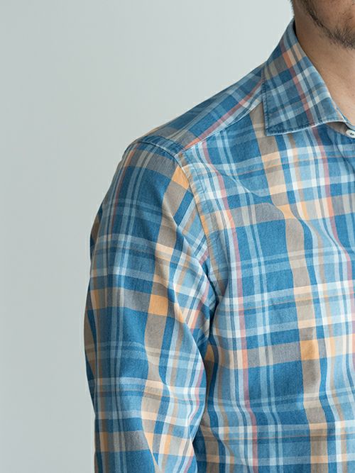幼い印象になりがちなマドラスチェックを、カラーリングの妙と適度なワイド襟で上品に仕上げた一着。