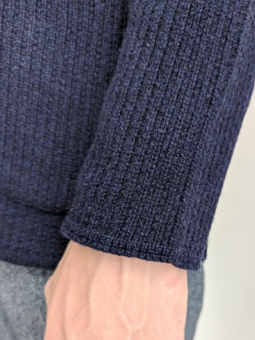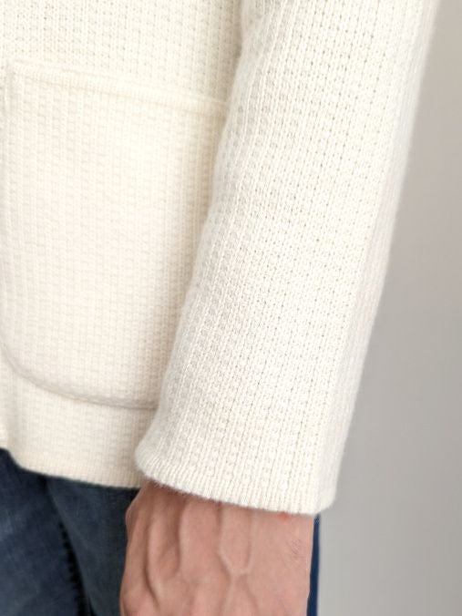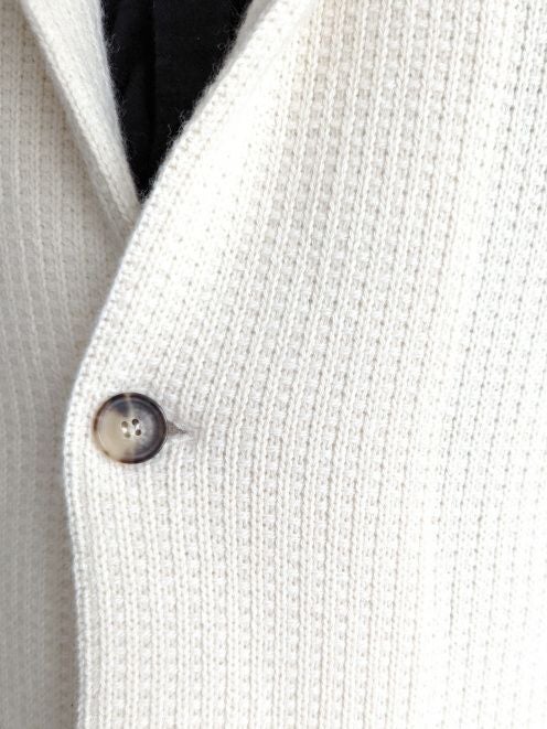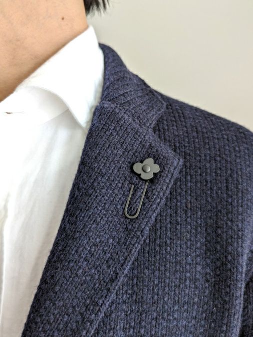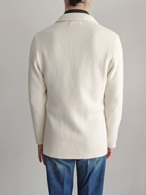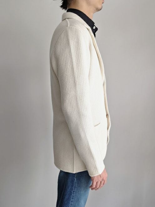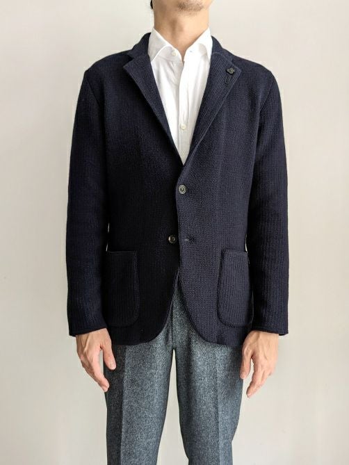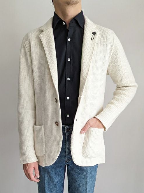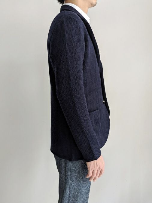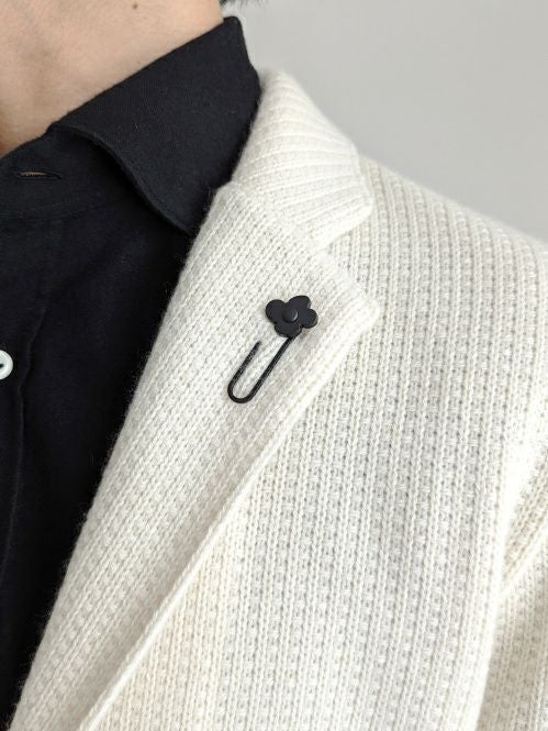 ノッチドラペルにフロントのパッチポケット、袖と背共に裏地はなしのカジュアルなデザイン。シンプルであるが故にカシミヤ100%の生地と、上質な仕立てが際立っており、ブランドアイコンでもあるブートニエールがその名の通り花を添えます。