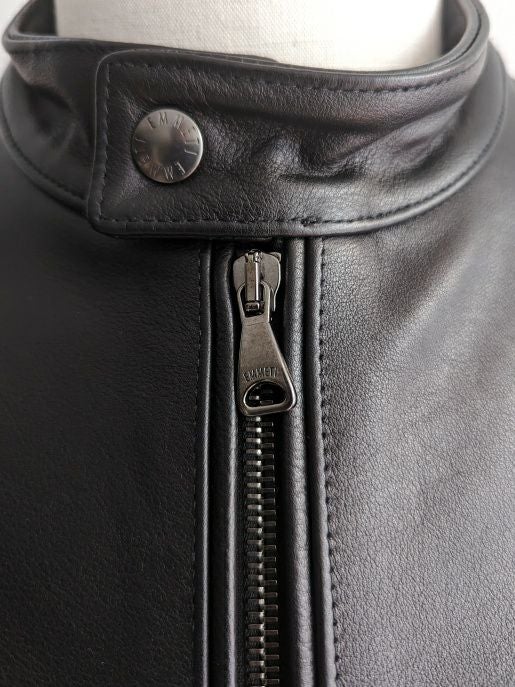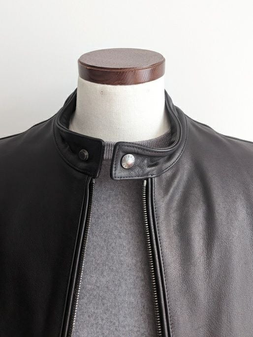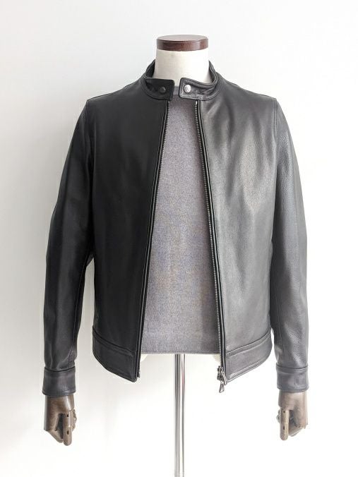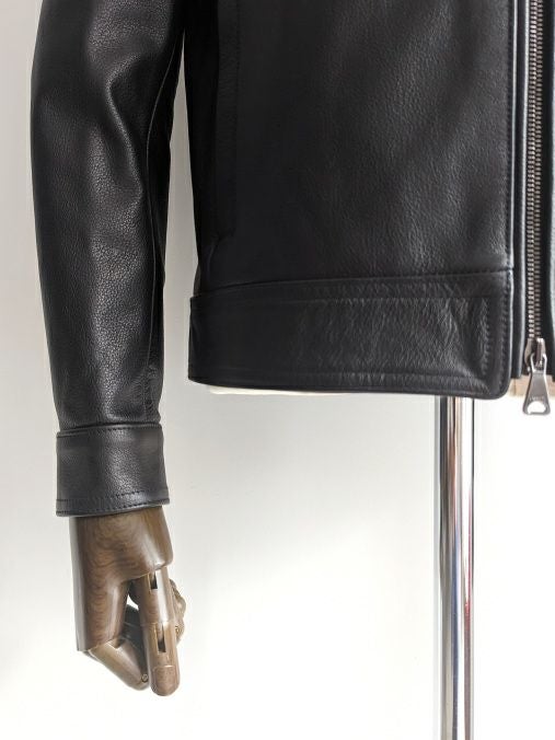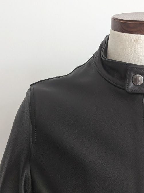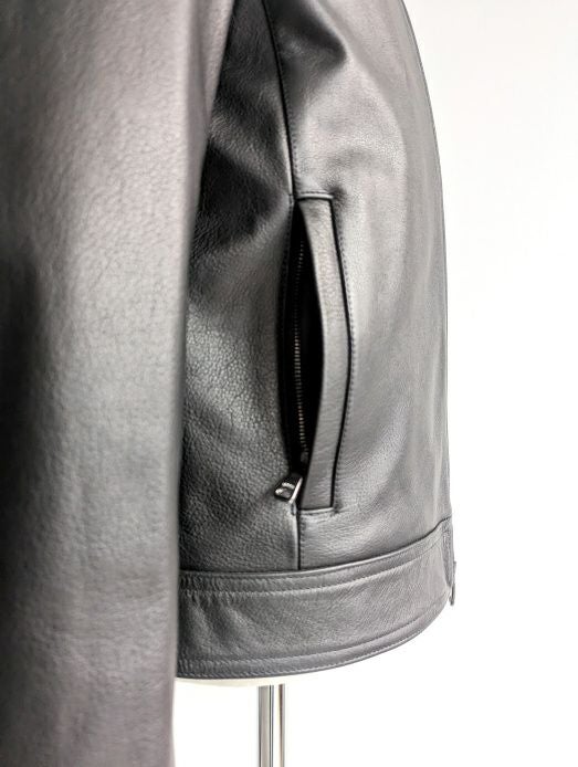 シングル仕立てのライダースデザインはスタイリッシュな印象。フロントはシルバーカラーのダブルジップ仕様。袖口のスナップボタンやジップで開閉できるフロントの縦ポケットなど、実用性とエレガントな魅力を兼ね備えています。