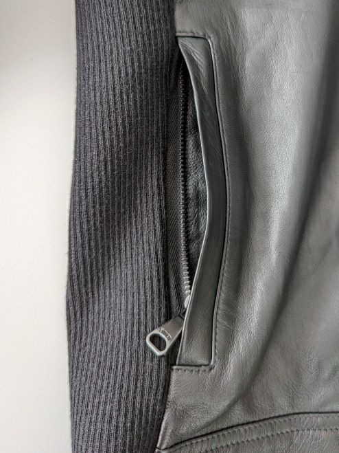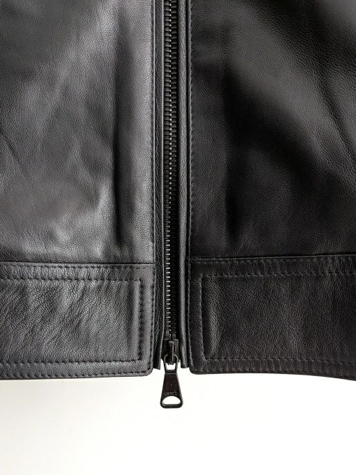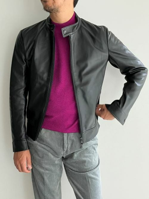 シングル仕立てのライダースデザインはスタイリッシュな印象。フロントはブラックカラーのダブルジップ仕様。袖口のスナップボタンやジップで開閉できるフロントの縦ポケットなど、実用性とエレガントな魅力を兼ね備えています。