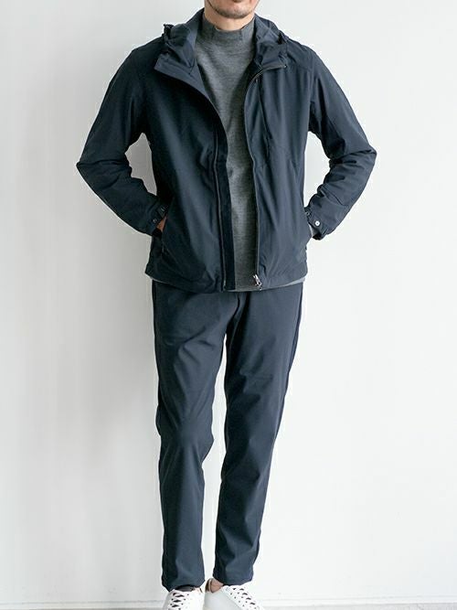 この生地は極細ナイロンとライクラを結束したもので、強い耐久性と物質安定性、また回復力にも優れ、また、UVカットで防シワ性、丸洗い可能とゴルフやジムなどのスポーツ時にも適しています。まさに大人がジムへの行き帰りなどで着用したり、綺麗めのパンツと合わせて単品使いもできるアイテムです。各パーツは春夏物同様に一つ一つ拘って選んだもの。ファスナーも勿論、Lampoに別注したSuper Lampoの逆開を採用しました。ブルゾンはポケッタブルになりますが、生地が少し厚手になった分、収納時の袋を少し大きく変更しています。