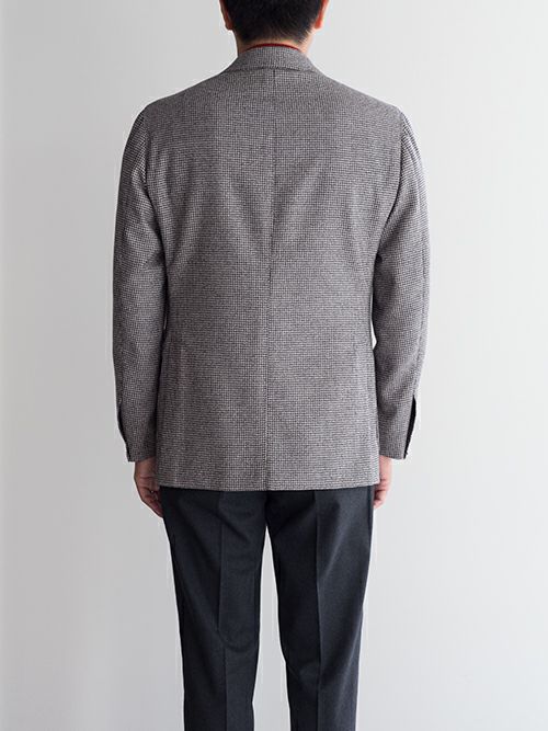 コンパクトな肩幅や高く登った登り。メリハリの効いたシルエットや丸みのあるポケット。ダブルステッチやマニカカミーチャなど、様々な拘りのディテールが目を惹く至極のハウンドトゥース柄ジャケット。