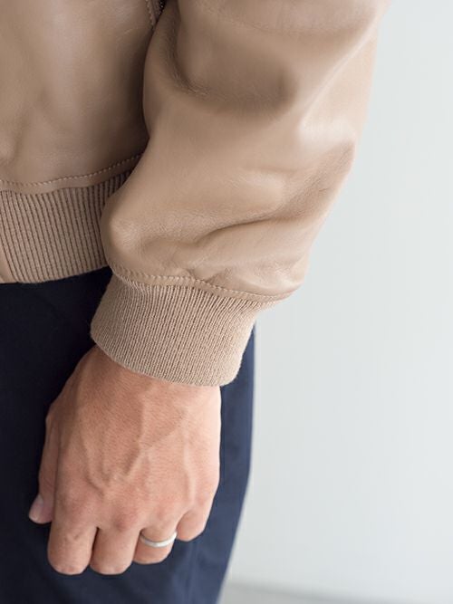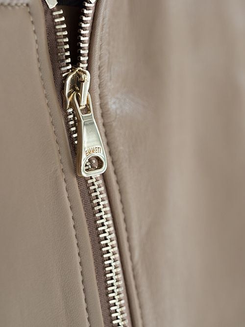 ラグラン仕様の肩回りは可動域が広く、まさに肩肘張らない大人のレザーブルゾンと言えます。それでいて野暮ったさは皆無の美しいシルエットとゴールドのダブルジップが高級感と上品さを漂わせる一着。