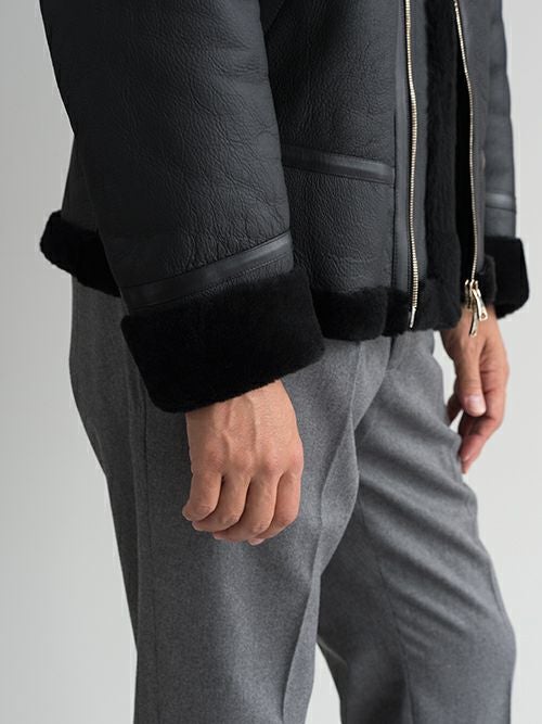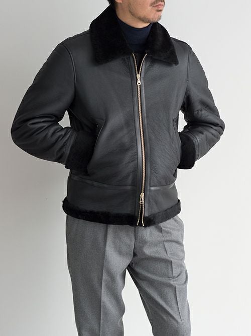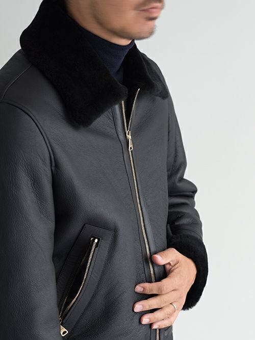 ベースとなっているモデルはアメリカ空軍のB-3ですが、羊革の柔らかな質感、ゴールドのファスナーが無骨さを払拭し、高級感を纏った仕上がりです。