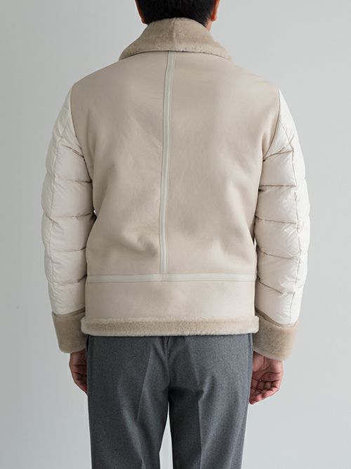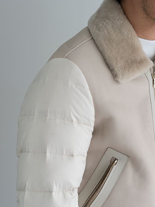 身頃がムートン、アームがダウンを詰めたナイロン袖になったモデルHOLT。デザイン性と保温性を兼ね備えた他にはない特別な一着です。