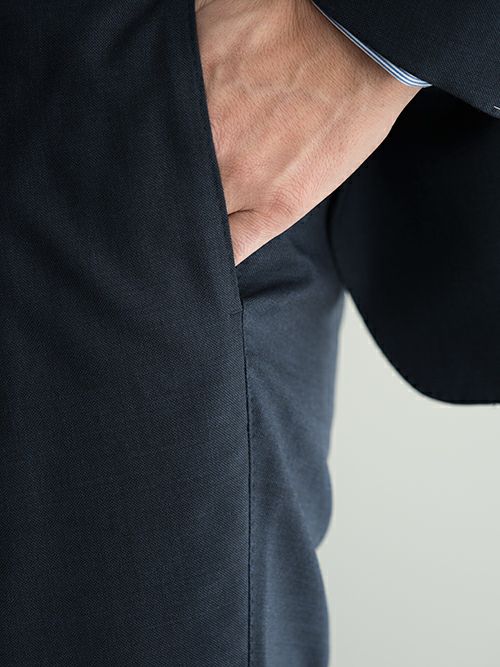 イタリアのCARLO BARBERA生地を使用した、軽やかな着心地の春夏のスーツ。タイドアップや、インナーにニットと合わせるなど、幅広く着用いただけます。ジャケットはノッチドラペル、フラップポケットで3つボタンの段返り仕様。毛芯には本バス毛芯(馬の尾毛)を使用し、衿元から胸にかけてハリを与え立体的なシルエットをになります。毛芯の中でも最高峰の物を使用しております。
