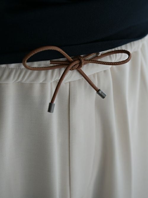 レーヨンポリエステル混生地のイージーパンツ。ウエストは快適な履き心地が叶うゴム仕様で、フロントのドローコードでサイズの微調節も可能でです。