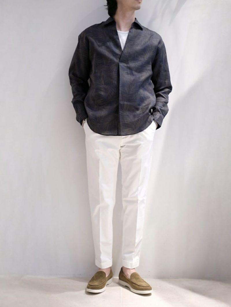 大きく開いたスキッパーカラーに、雰囲気の良いボタニカルが相まって色気のある大人のリゾートムードを演出します。