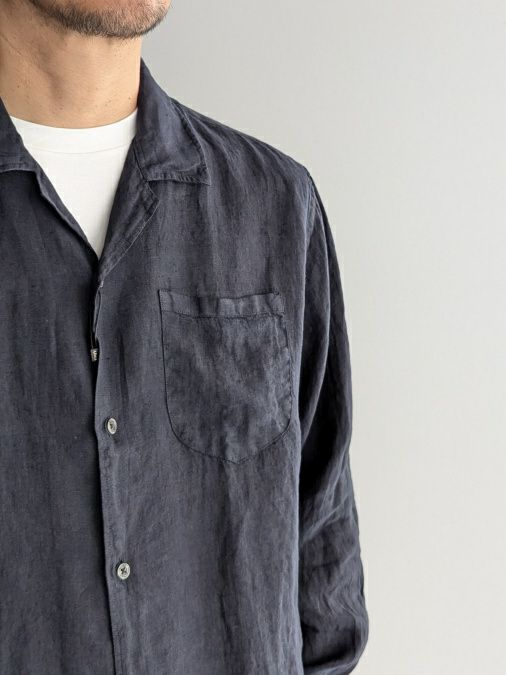 程よくゆとりを持たせたシルエットが魅力的な、オープンカラーのリネンシャツ。着用した際のシルエットも絶妙に良く、ショーツやリラックスパンツと合わせたリゾートコーディネートはもちろん、カジュアルジャケットのインナーとしても見劣りしない上品な雰囲気を纏っています。