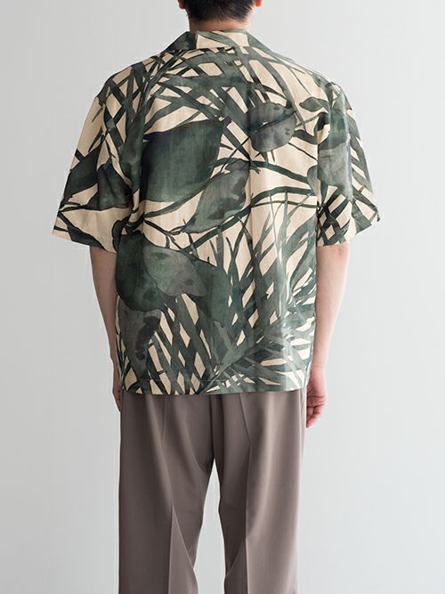 リゾート感漂う大胆なリーフプリントが目を惹くオープンカラーシャツ。ナチュラルなベージュベースに、深みのあるグリーンのリーフ柄をあしらい、落ち着きと華やかさを両立しています。