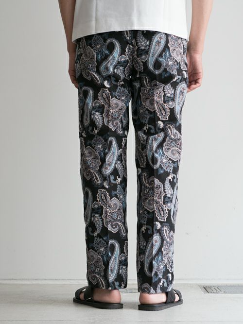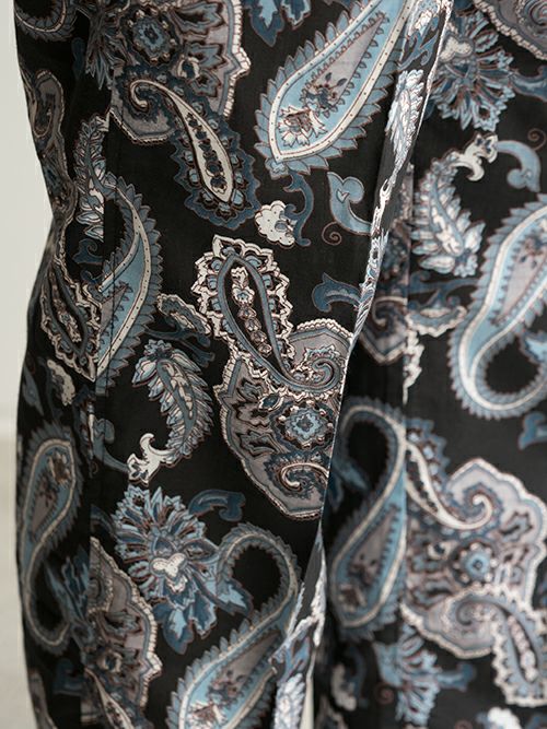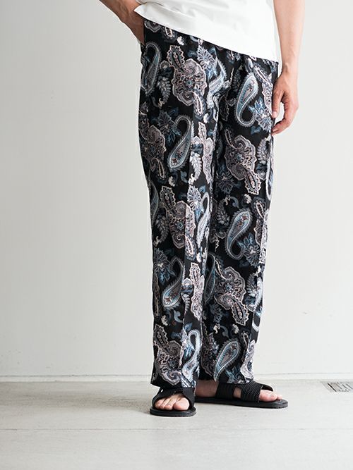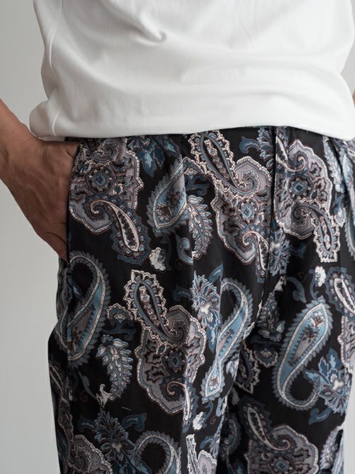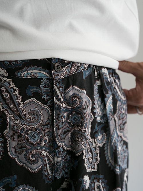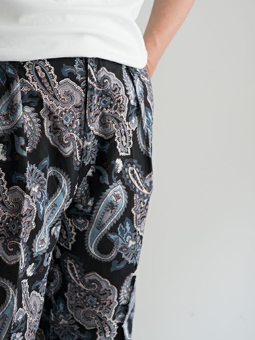 存在感抜群のペイズリー柄が目を惹くリラックスパンツ。ブラックをベースにブルーやグレーのアクセントカラーを効かせ、上品さと遊び心を兼ね備えた一着です。柔らかく軽やかな素材感で、穿き心地も抜群。