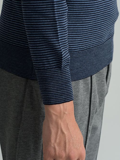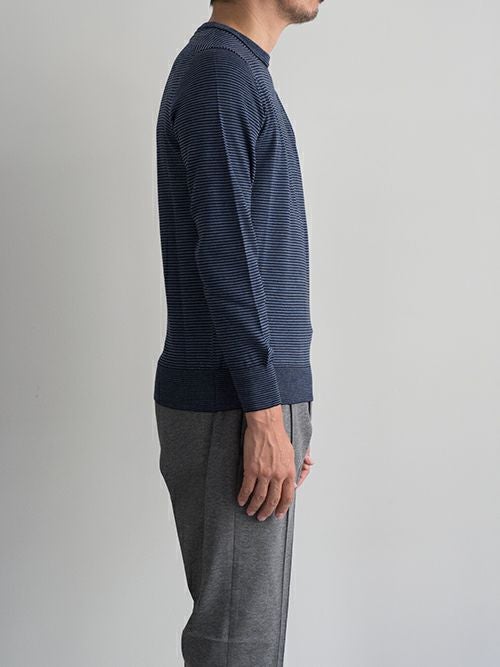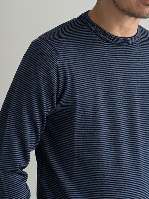 程よくゆとりを持たせながらも、すっきりとした印象は損なわない大人のクルーネックニット。ピッチの細かい上品なボーダー柄で、統一感のあるカラーリングです。