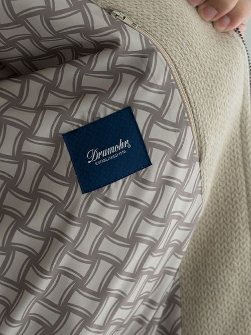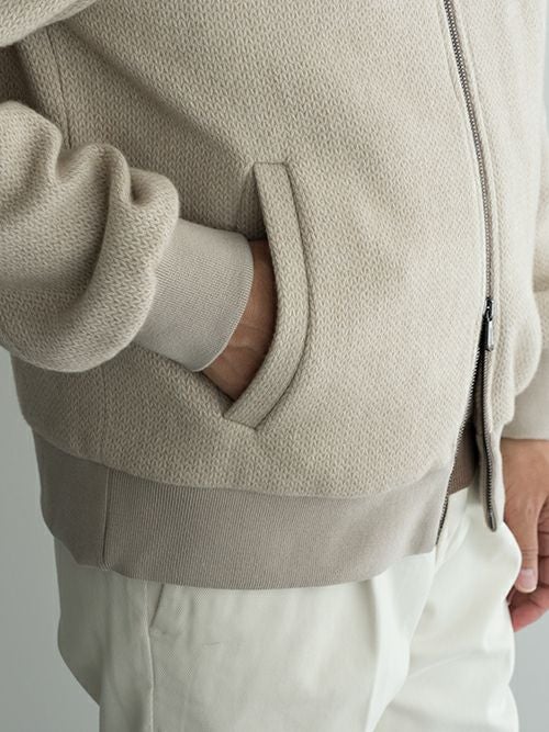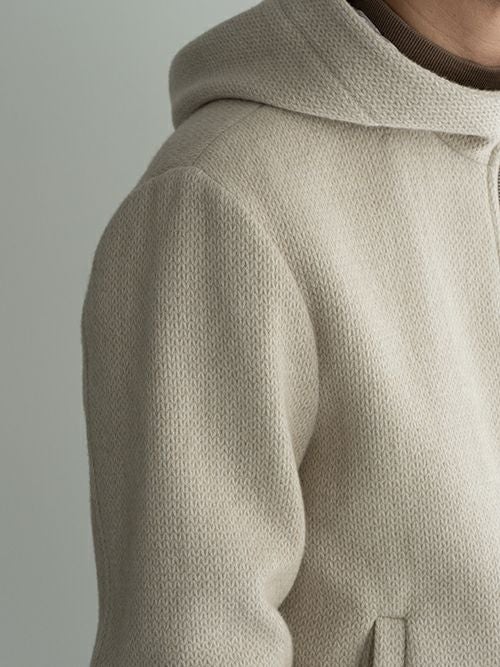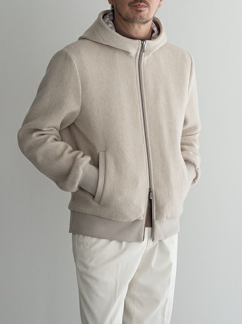 ウール、シルク、カシミヤ三者混のニットフーディ。見た目の高級感もさることながら、ダブルジップ仕様、サイドポケット完備、裏地付きによる防風性と着脱のし易さなど、実用性の高さも魅力的な一着です。