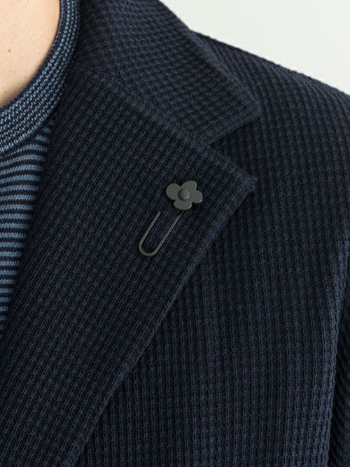ノッチドラペルにフロントのパッチポケット、そしてサイドベンツのカジュアル且つシンプルなディテールが、生地の上質さと仕立ての良さを際立たせており、ブランドアイコンでもあるブートニエールがその名の通り花を添えます。