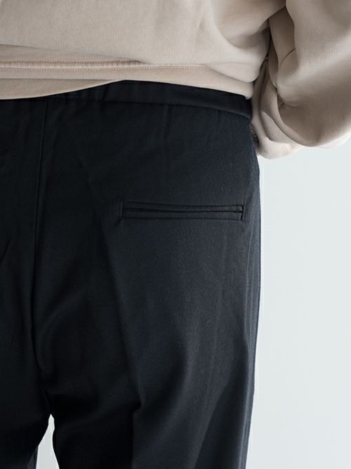 ゆとりのあるシルエットで、リラックス感のあるイージーパンツ。ノータックですが、比較的股上が深いデザインでヒップには余裕を持たせています。
