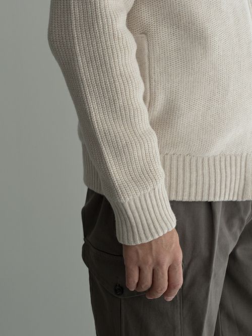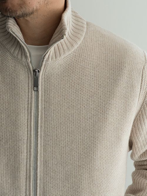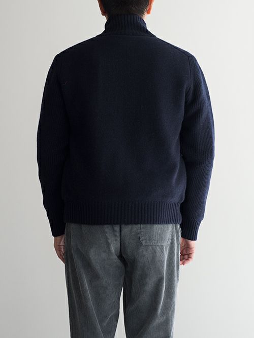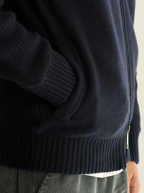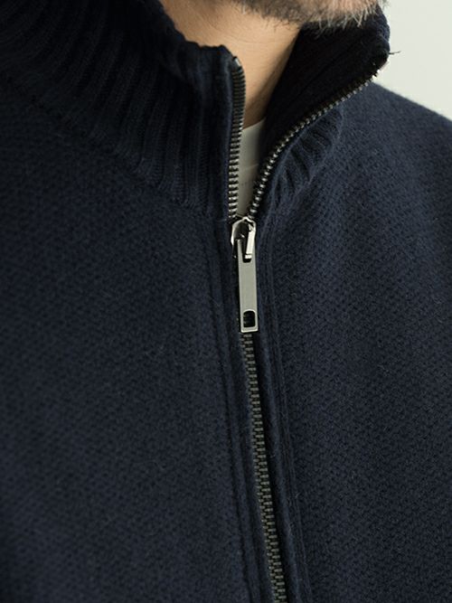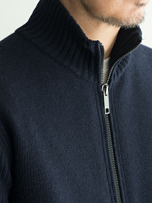 ウール、ナイロンブレンドのドライバーズニット。ダブルジップ仕様、サイドポケット完備、リブ編みによる立体感と伸縮性など、利便性も高い拘りの仕上がりです。生地はとても肉厚で、ライニングには滑らかな肌触りのファーを使用。防寒性も抜群の一着です。