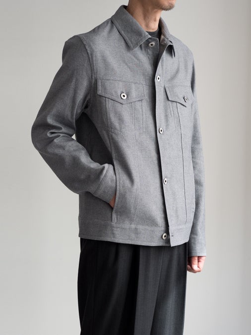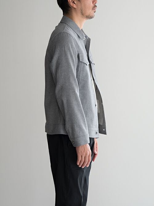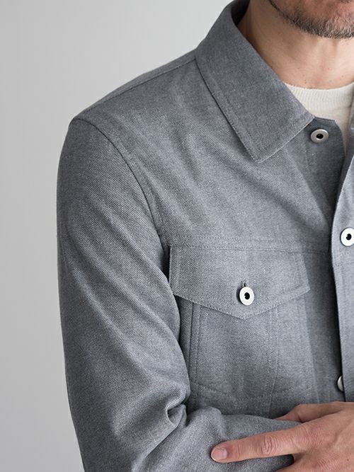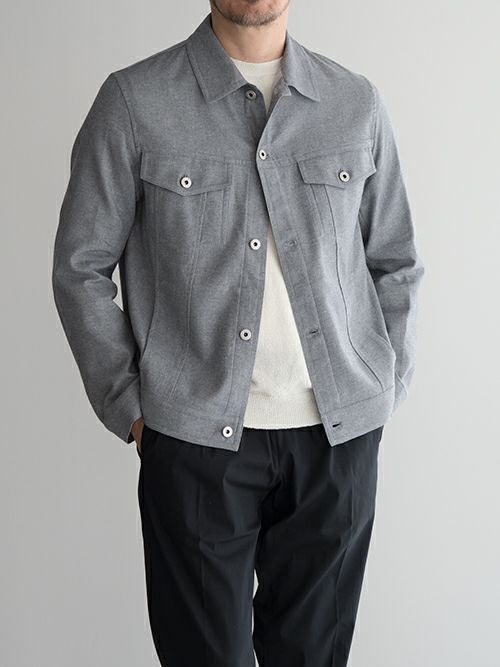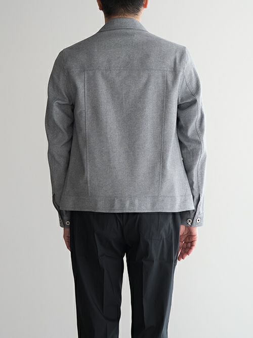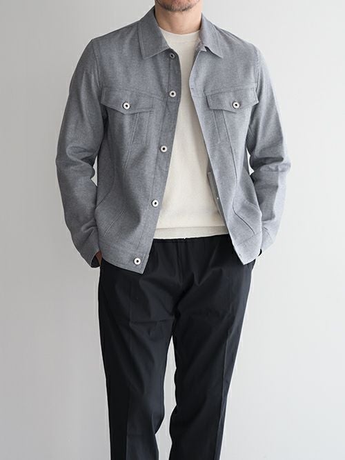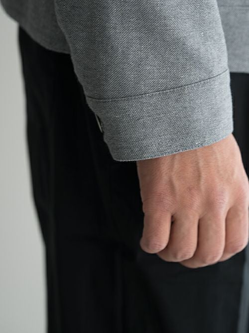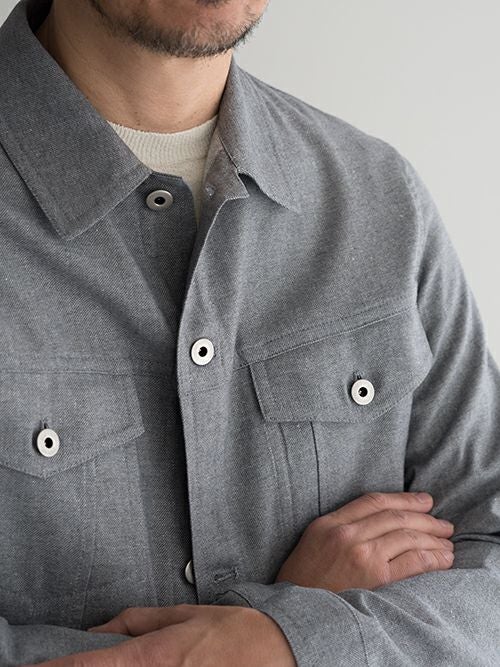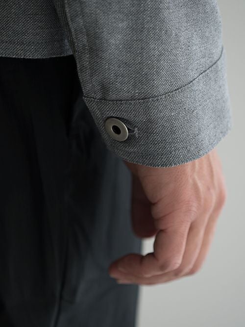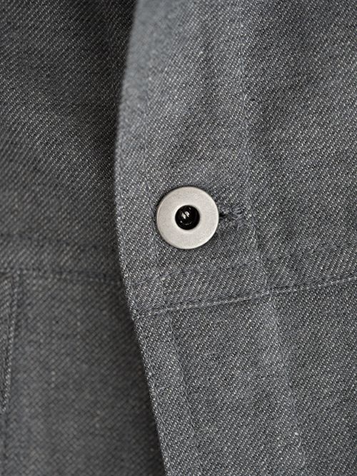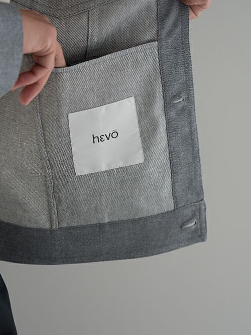 程よいゆとりがリラックス感を演出するHEVOのCARPINO(カルピーノ)。今回デリバリーしたのは、ポリエステル×綿×麻×ポリウレタンのライトオンスデニム生地です。非常に軽やかな着用感で、季節の変わり目には重宝する一着。