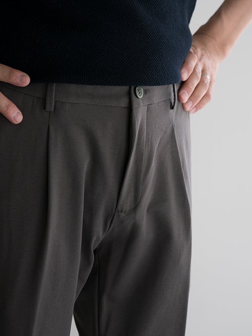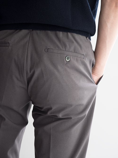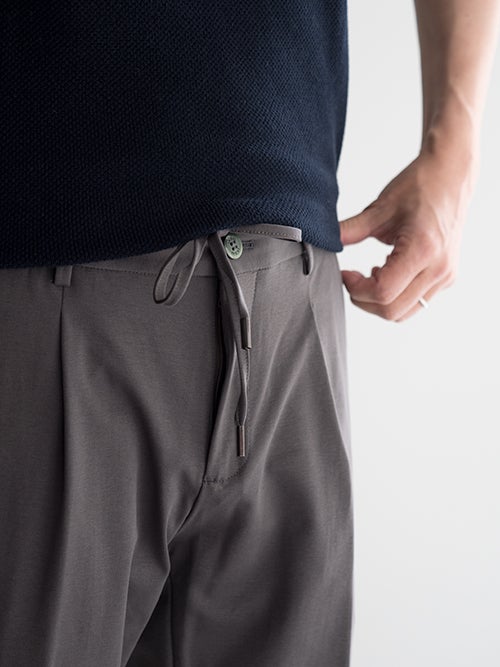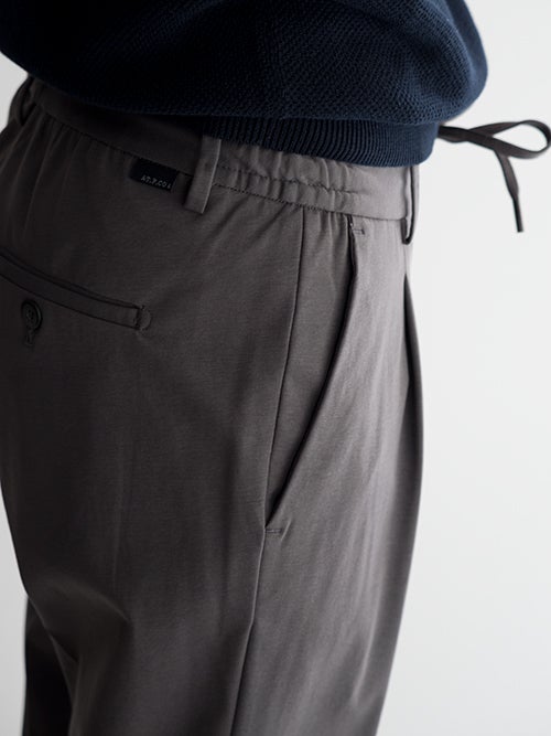 ウエストはサイドシャーリングのドローコード仕様。すっきりした腰回りと裾幅でありながら、ストレッチが効いているため窮屈さを感じずに着用いただけます。