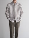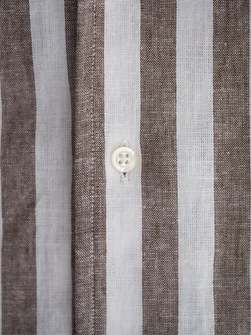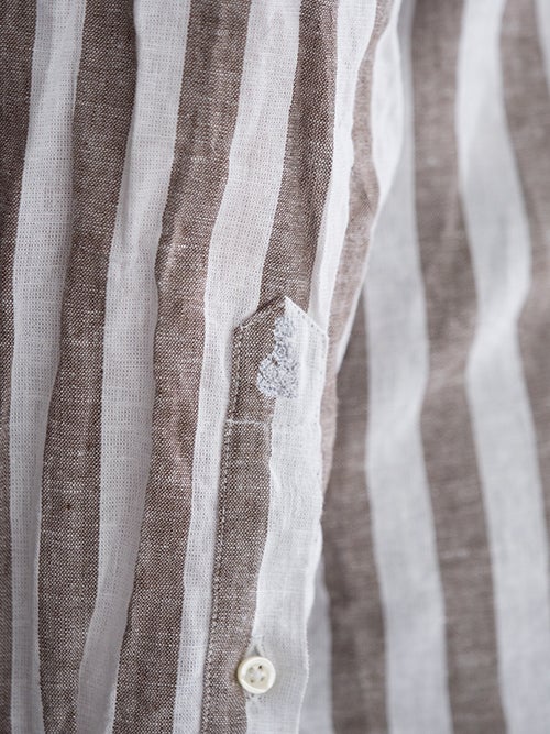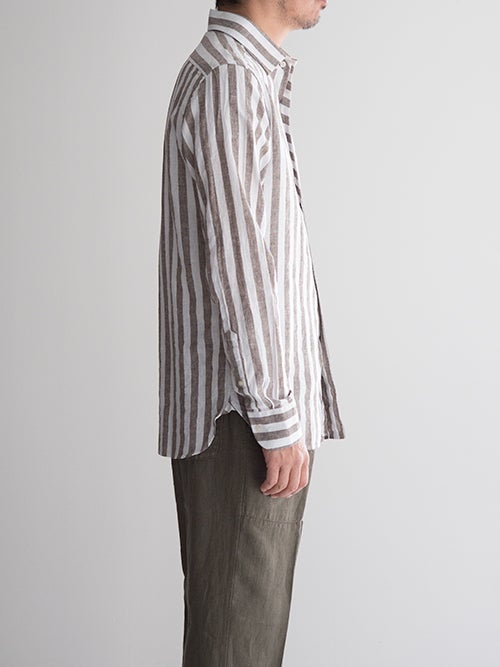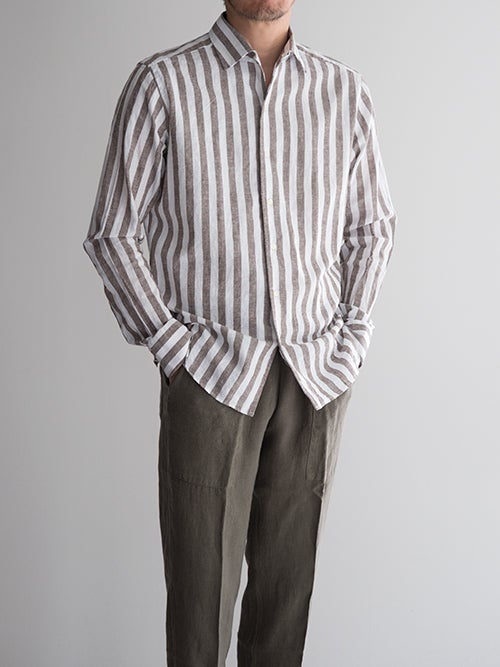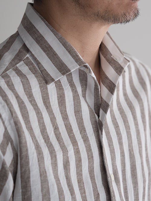 今年らしいアーシーなBROWNのロンドンストライプ。シルエットは比較的すっきりと細身で、夏場のジャケットインナーとしても重宝する一着です。