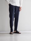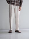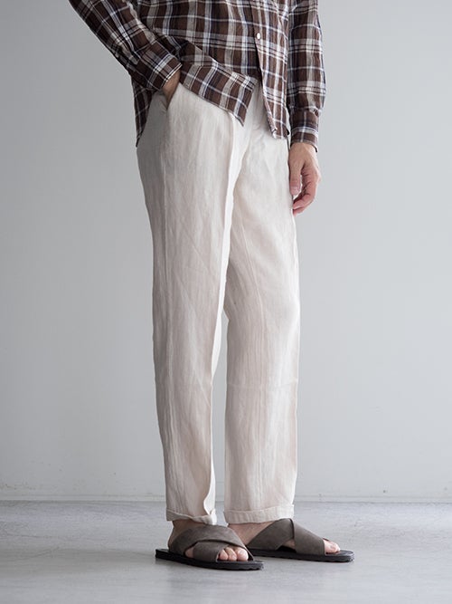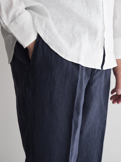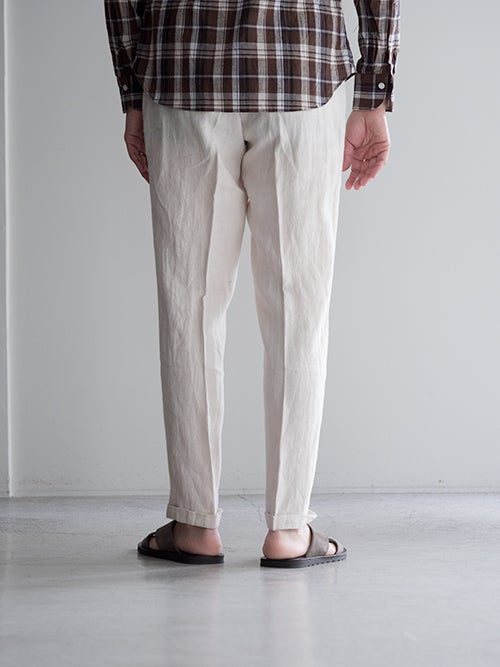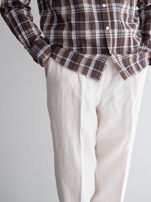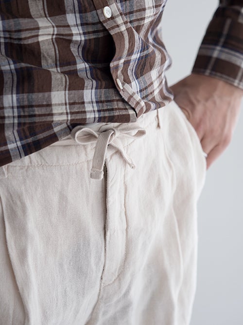 春夏に適したリネン生地。ワタリをやや広めにとったワンタックのテーパードパンツです。ドローコードによりウエストの調整が可能で、背面はシャーリング仕様でストレスフリーの着用感です。