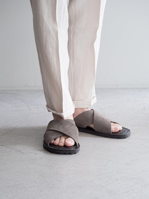 レザーのサンダルやスニーカーを足元に合わせると、上品なリラックス感を演出してくれます。