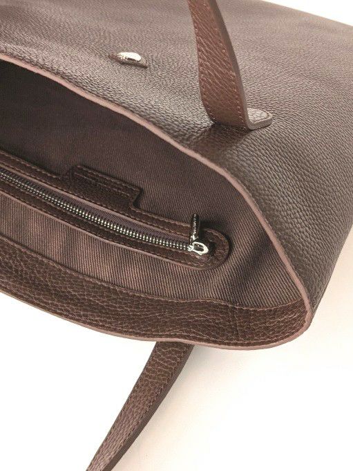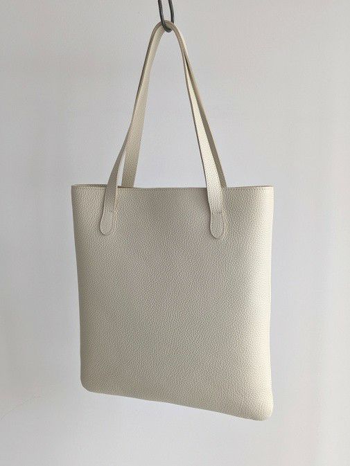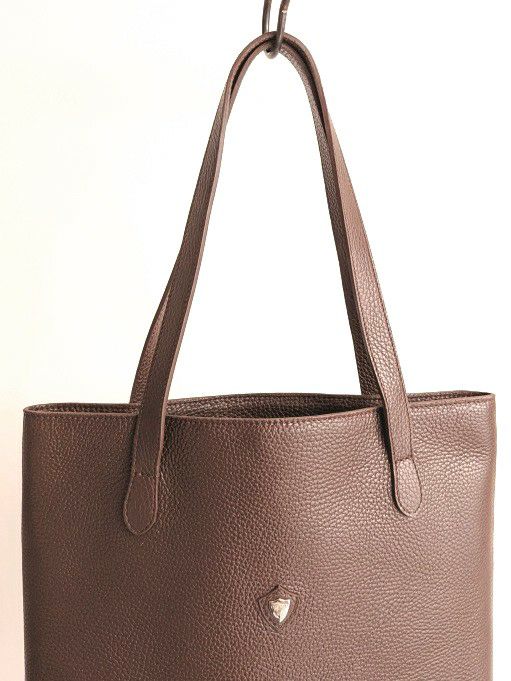上質なシュリンクレザーを使用したトートバッグ。マチなしでスタイリッシュなデザインが魅力的です。丁度良いサイズ感で、ウォレットやスマートフォンなど身の回りの小物が収まり、使い勝手も抜群。デザイン性を高めるエンブレムが、高級感や上品さを感じさせます。