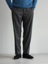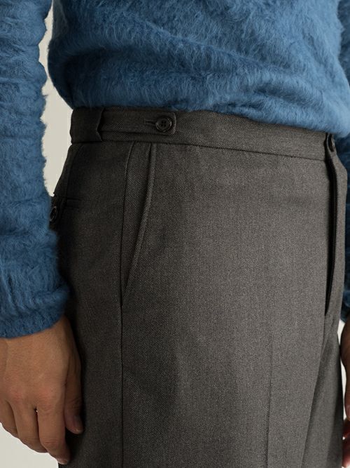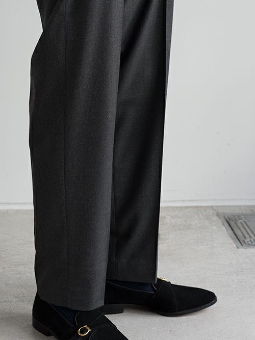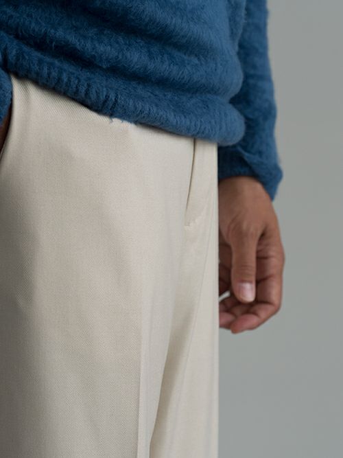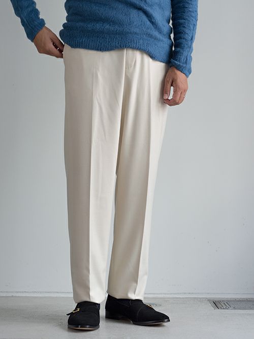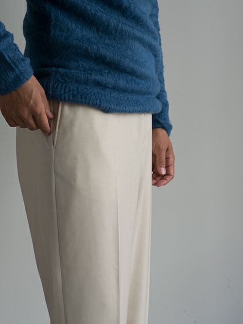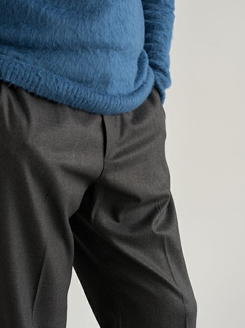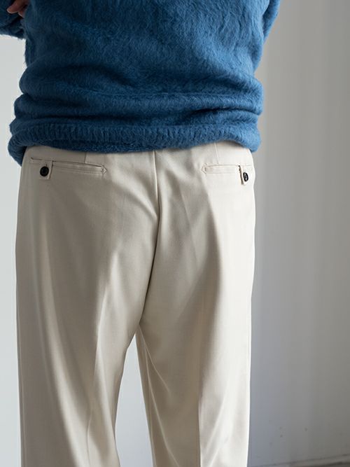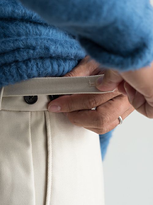 ノータックで腰回りはすっきりと見せ、裾に向かって緩やかにテーパードした上品なシルエットの一着。ウエスト両サイドはアジャスト仕様になっており、サイズの微調整が可能です。