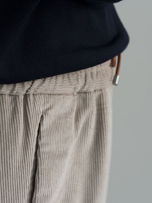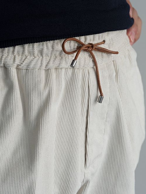 コーデュロイ生地のイージーパンツ。ウエストは快適な履き心地が叶うゴム仕様で、フロントのドローコードでサイズの微調節も可能でです。