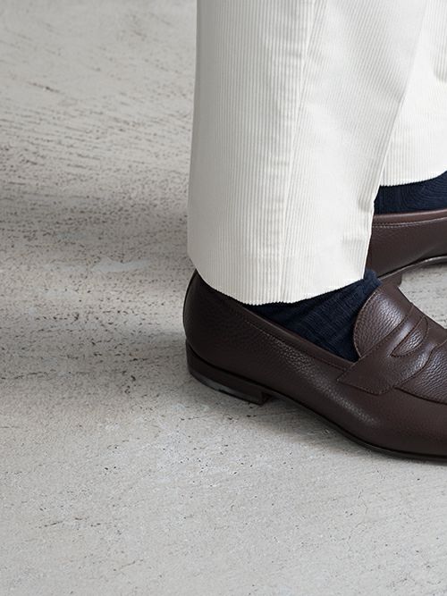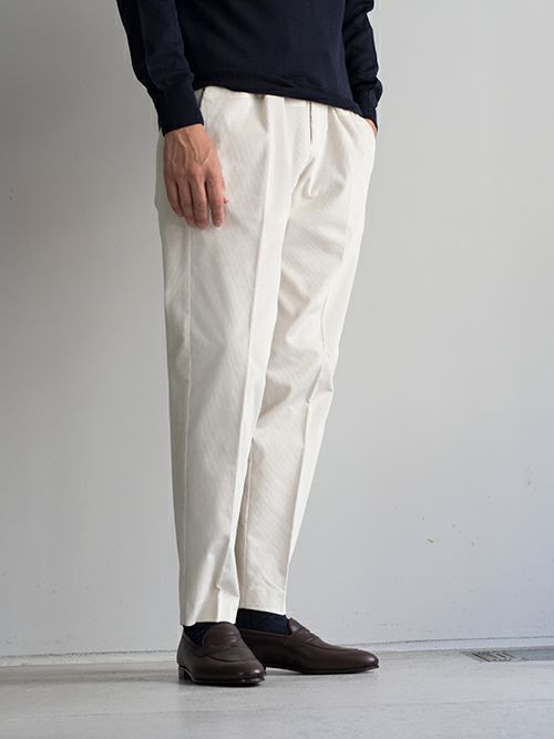 ニットやシャツと合わせたカジュアルなコーディネートから、ジャケットスタイルまでこなす汎用性の高さも際立つ一着です。裾幅は比較的細めなので、シューズはミニマムなスニーカーやローファーがお薦め。