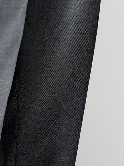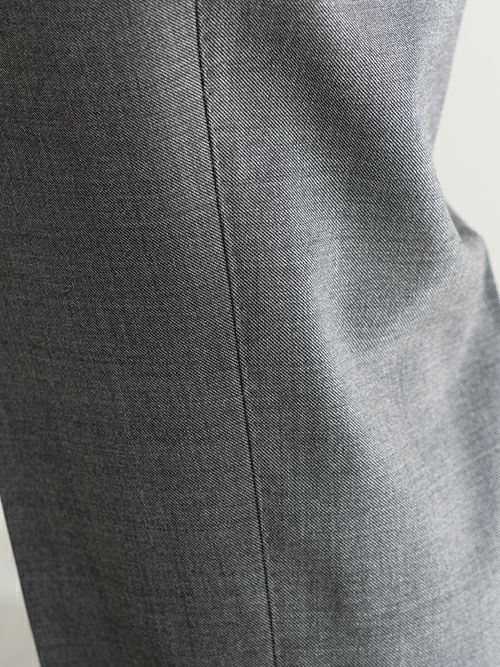 ジャケットスタイルのボトムスには欠かせないスラックス。定番のGRAYは、モデルのようなNAVYジャケットだけでなく様々なカラーのジャケットとも相性の良い万能な一着。梳毛のウールを使用しており、秋の立ち上がりから真冬まで、長く活躍してくれます。
