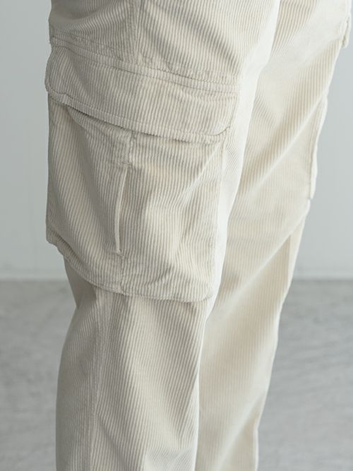 秋冬らしいコーデュロイ生地で、いわゆるドレスカーゴと言われるモデル「AIKO」。ノータックで股上も比較的浅く、全体的に細めのテーパードシルエットです。