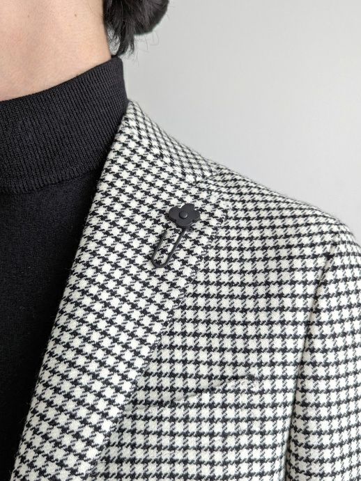 ブランド象徴のブートニエールがアクセントとなり、スタイリングに花を添えます。