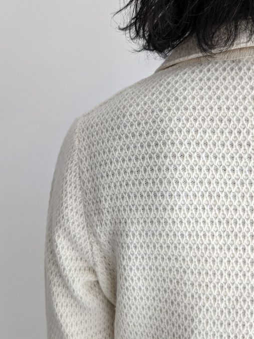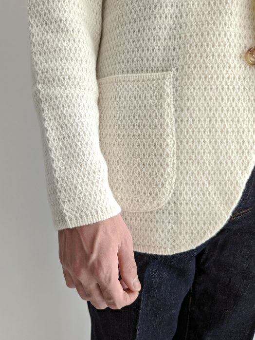 ノッチドラペルにフロントのパッチポケット、袖と背共に裏地はなしのカジュアルなデザイン。シンプルであるが故にカシミヤ100%の生地と、上質な仕立てが際立っており、ブランドアイコンでもあるブートニエールがその名の通り花を添えます。