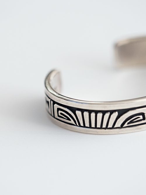 Begay独特のオーバーレイは美しいの一言に尽きます。その中幾何学的紋様を、Silver.925のプレートにしっかりと刻りこまれたデザインが特徴的です。HOPI族のオーバーレイに比べて柔らかい印象が特徴的です。同じデザインの作品は作らないため、全てパターンが異なっております。ナバホの巨匠Steven Joe Begay.製作のジュエリーは神秘的な輝きと重要な意味を持って世界中の人々を魅了します。