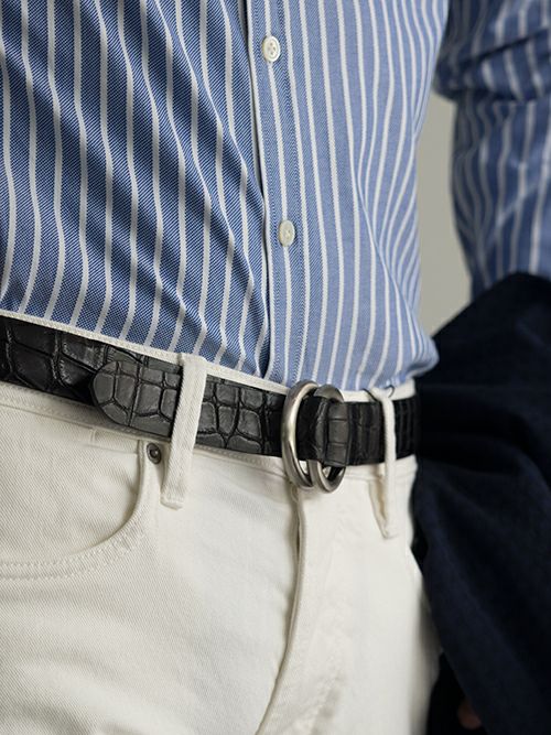 厚みのあるクロコダイルレザーは、班も大きく高級感があり、30mmという太さと真鍮製のバックルが非常にモダンな印象。デニムやファイブポケットパンツには勿論ですが、ドレススタイルに合わせて頂くのもおすすめです。