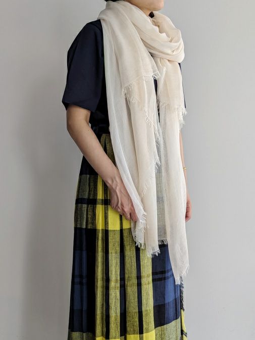 適度なボリューム感で巻きやすく、マフラーのようにぐるっと巻いたり、肩から掛けたりと様々なアレンジを楽しんで頂け、ジャケットやカットソーともよく合います