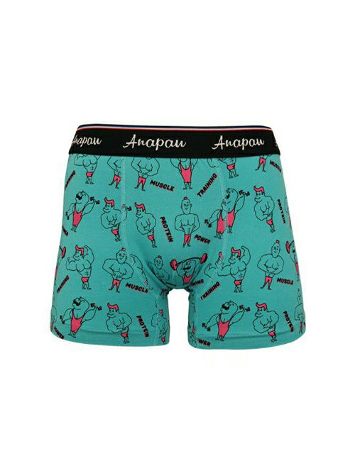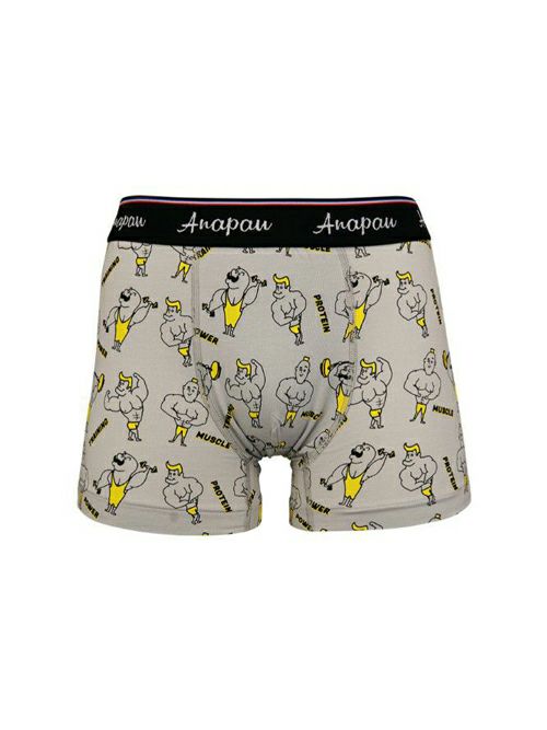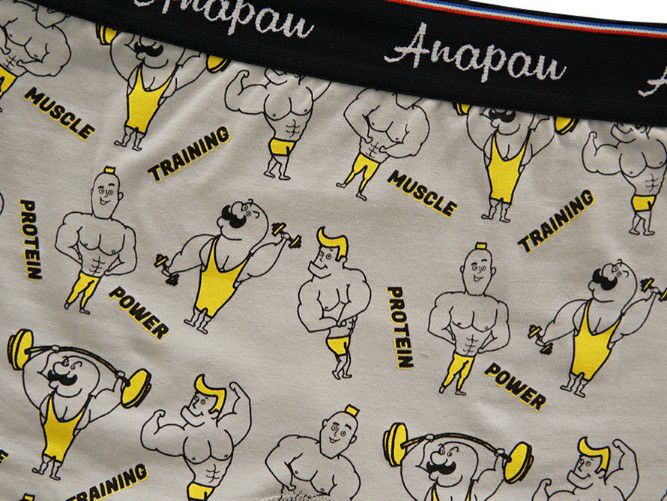 「マッチョな人も、だらしない人も、これを穿けばみんなマッチョ!!」をテーマにした、ジムに行く日に穿きたくなる柄。