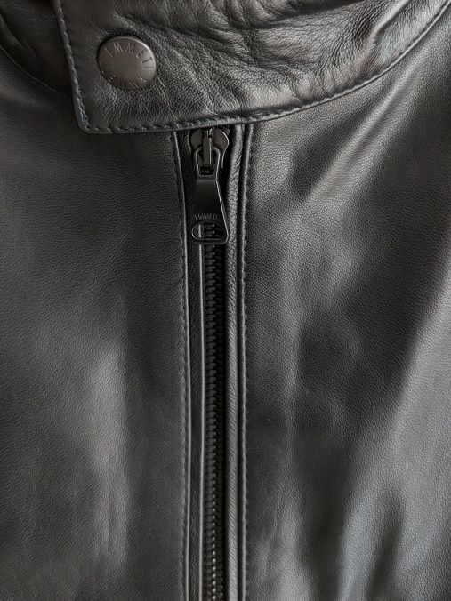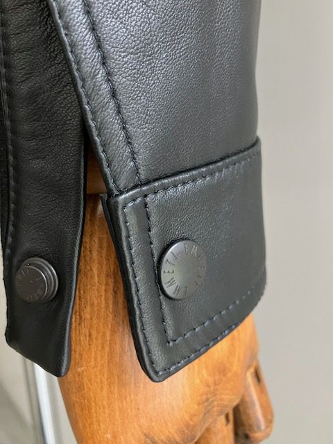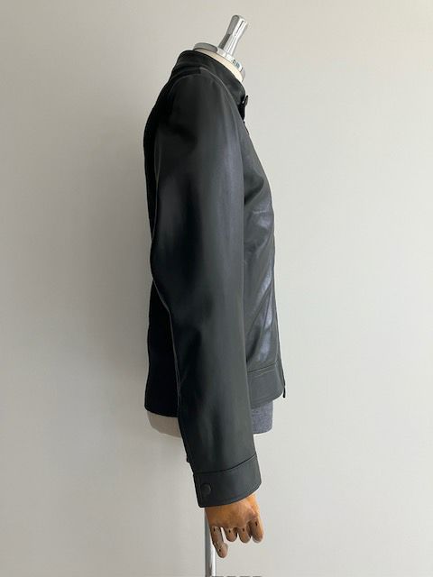シングル仕立てのライダースデザインはスタイリッシュな印象。フロントはブラックカラーのダブルジップ仕様。袖口のスナップボタンやジップで開閉できるフロントの縦ポケットなど、実用性とエレガントな魅力を兼ね備えています。