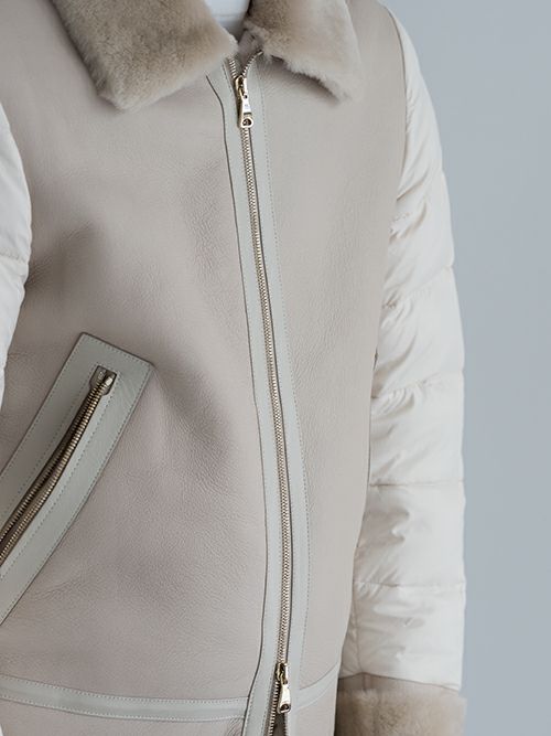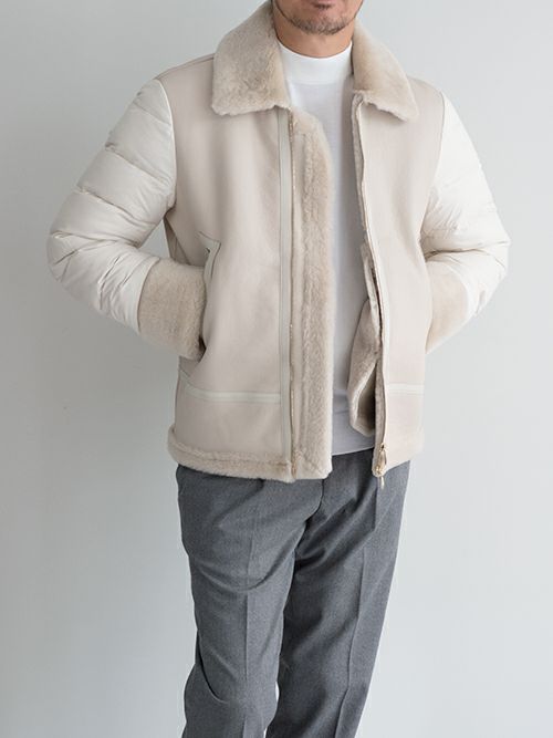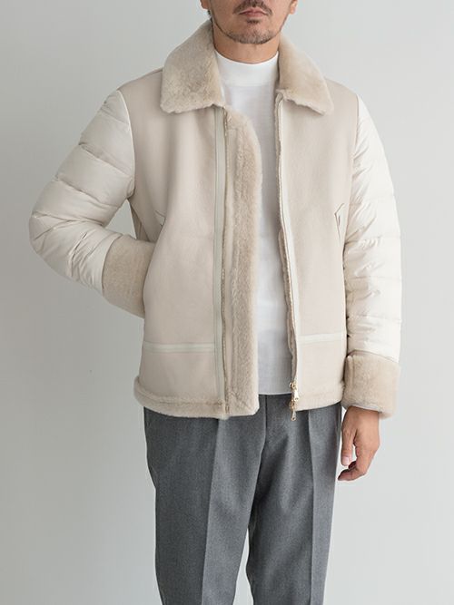 身頃がムートン、アームがダウンを詰めたナイロン袖になったモデルHOLT。デザイン性と保温性を兼ね備えた他にはない特別な一着です。