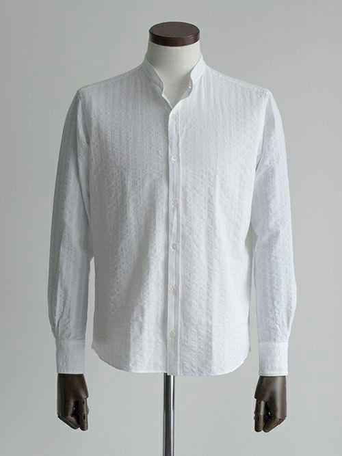 シアサッカー生地で季節感があり、ヘンリーネックのカットソーを思わせるようなバンドカラーで、ジャケットスタイルに程よい抜け感が生まれます。VINCIFIT(ブィンチフィット)のスリムなシルエットです。