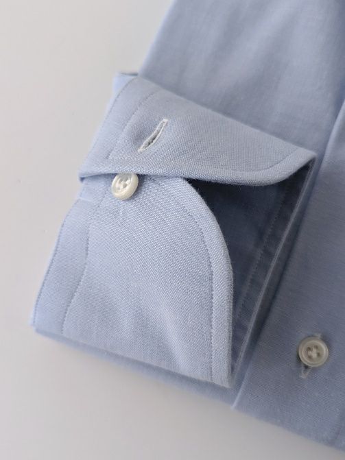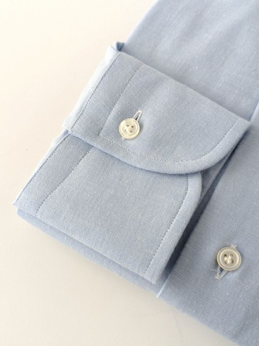 通常量産のシャツでは、生産効率のため脇縫いから袖先まで一気に縫い上げる物がほとんどですが、腕の運動量を考えた上、袖パーツを後付けし、より立体的に作り込んでいます。