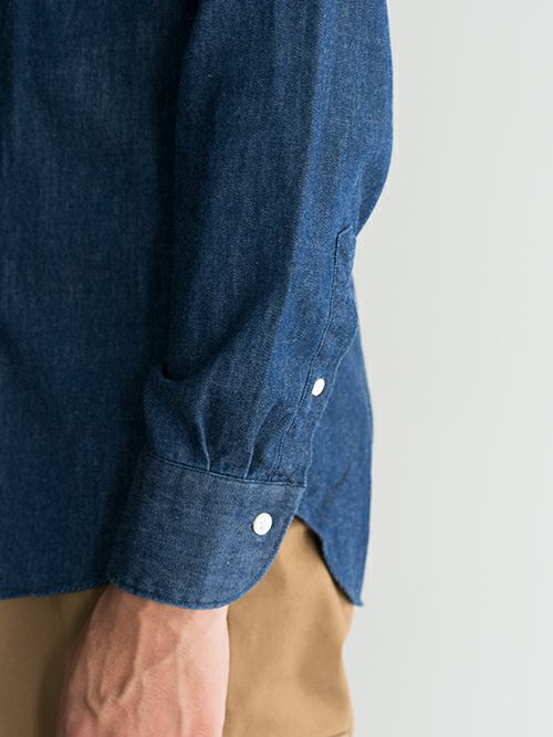通常量産のシャツでは、生産効率のため脇縫いから袖先まで一気に縫い上げる物がほとんどですが、腕の運動量を考えた上、袖パーツを後付けし、より立体的に作り込んでいます。