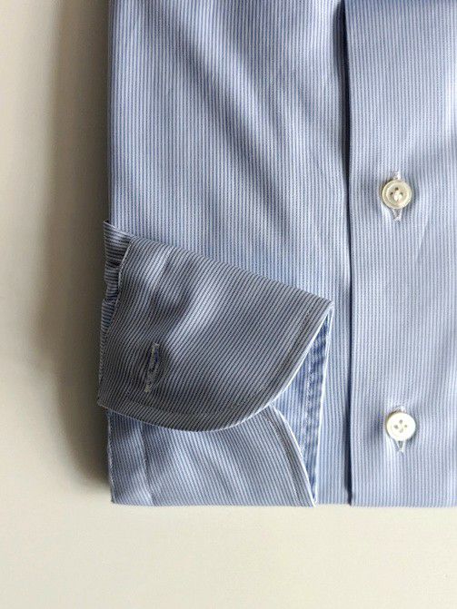 通常量産のシャツでは、生産効率のため脇縫いから袖先まで一気に縫い上げる物がほとんどですが、腕の運動量を考えた上、袖パーツを後付けし、より立体的に作り込んでいます。