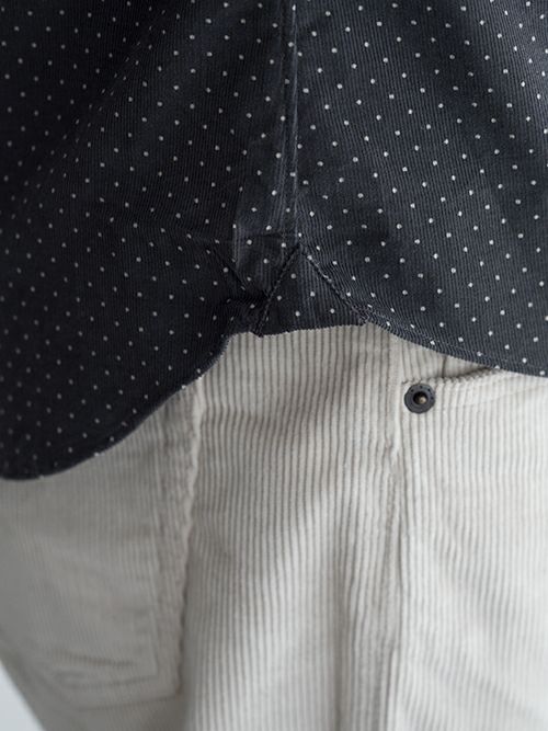 通常量産のシャツでは、生産効率のため脇縫いから袖先まで一気に縫い上げる物がほとんどですが、腕の運動量を考えた上、袖パーツを後付けし、より立体的に作り込んでいます。