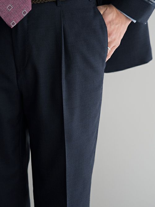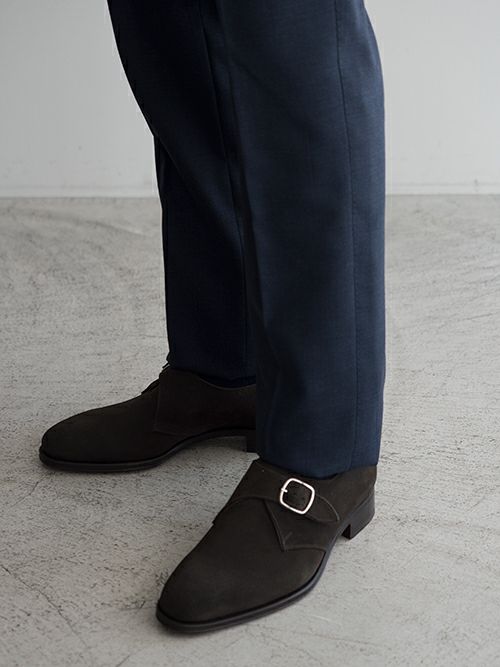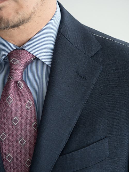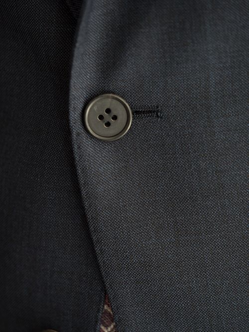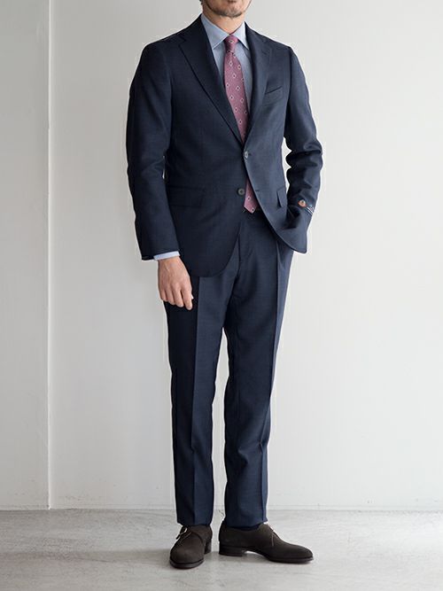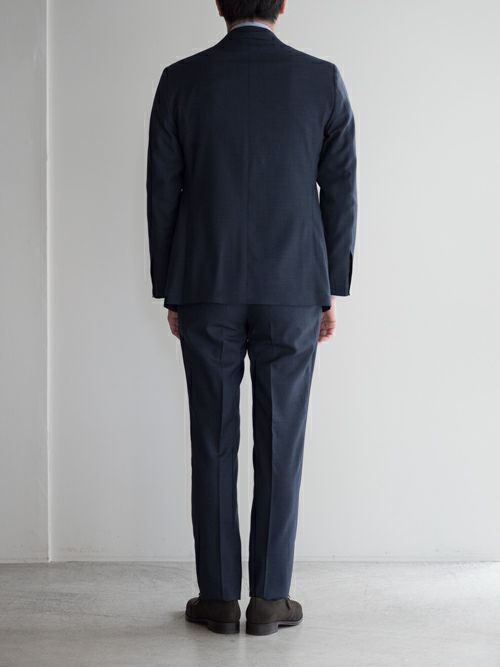 イタリアのCARLO BARBERA生地を使用した、軽やかな着心地の春夏のスーツ。タイドアップや、インナーにニットと合わせるなど、幅広く着用いただけます。ジャケットはノッチドラペル、フラップポケットで3つボタンの段返り仕様。毛芯には本バス毛芯(馬の尾毛)を使用し、衿元から胸にかけてハリを与え立体的なシルエットをになります。毛芯の中でも最高峰の物を使用しております。
