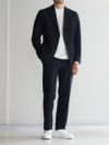ノッチドラペル3つボタンの段返り、ポケットはバルカパッチ仕様。サイドベンツで一枚芯の軽快なジャケットに仕上げています。パンツは2タックのウエストはドローコードとベルトループの2WAY仕様。