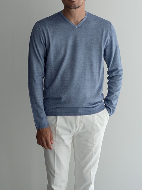 ハイゲージですが、一枚で着用した際にもしっかりと存在感のある適度な厚みや、浅めのVネックは汎用性の高い一着で、ジャケットのインナーには勿論ですがレザーアイテムのインナーとしても好相性です。