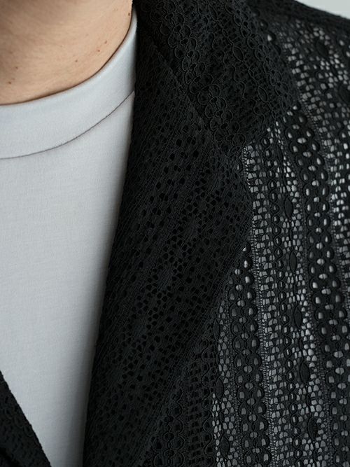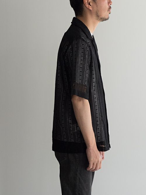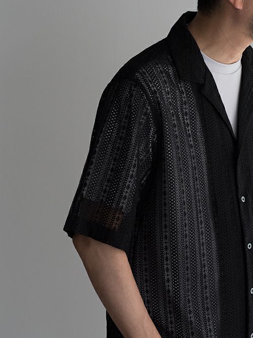 オープンカラーのメッシュ編みシャツ。トレンド感だけでなく、色気と上品さも併せ持つ一着です。
