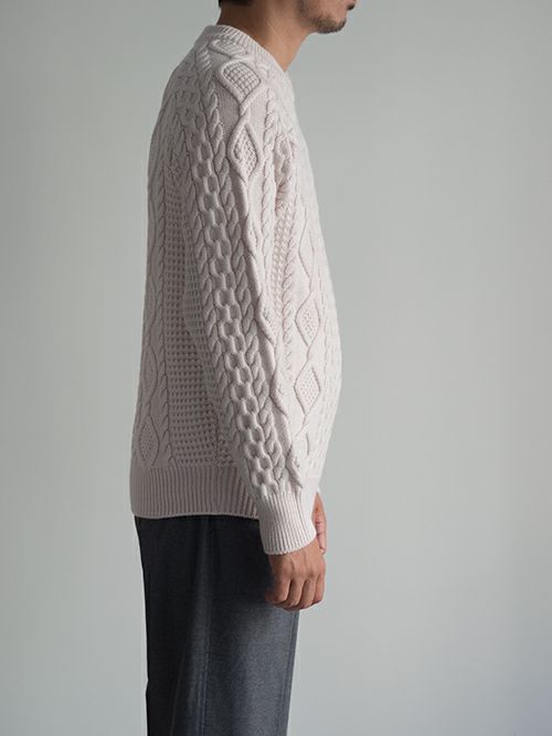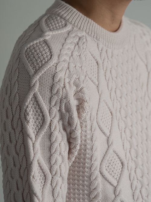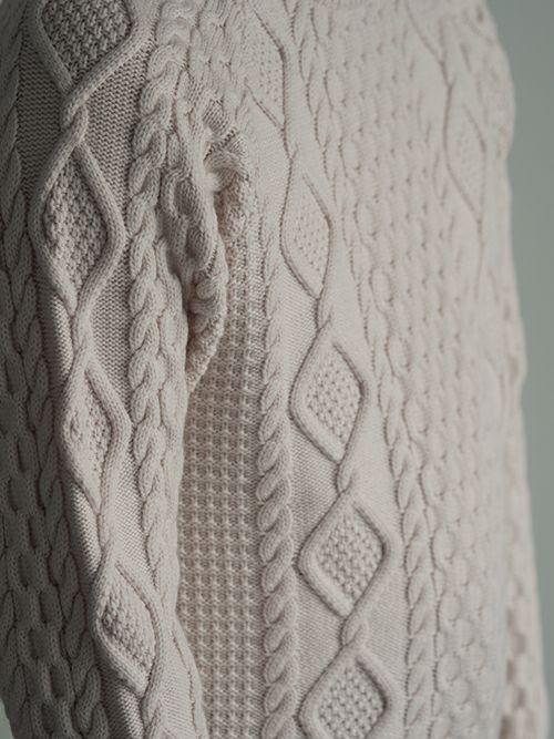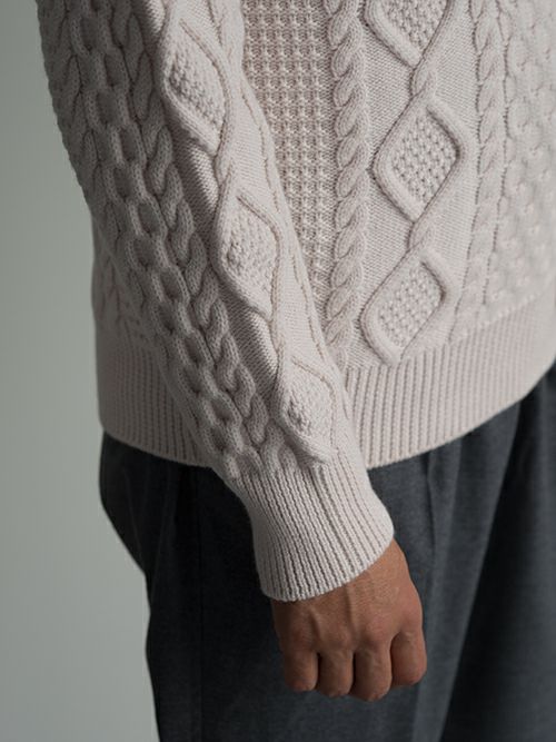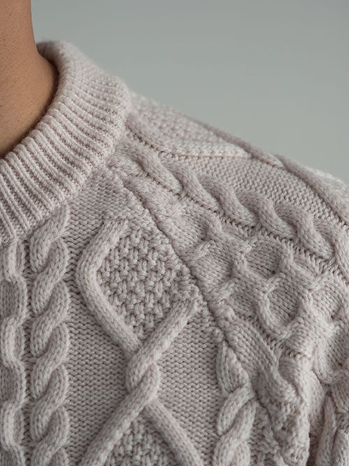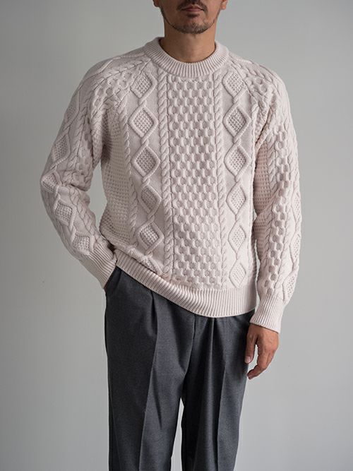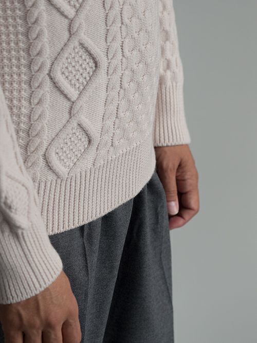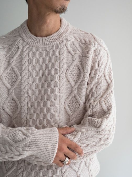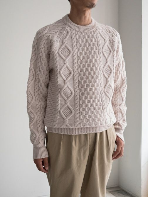 厳選されたウールを使用したフィッシャーマンニット。 一枚での着用も、アウターの中に着ても冬のコーディネートを彩り、楽しませてくれる魅力溢れるアイテムです。ラグランスリーブ仕様で肩回りにもリラックス感がある一着。